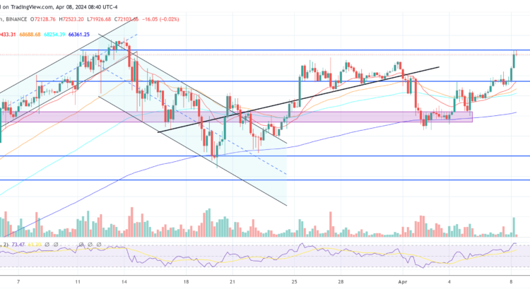 In the early US hours of Monday, Bitcoin witnessed a significant surge, with its price climbing above the $72,000 mark. The ascent, marked by a more than 4.5% increase within a mere five-hour window from below $69,500 to an intra-day high of $72,579, can be attributed to a confluence of factors that have stirred the crypto market.