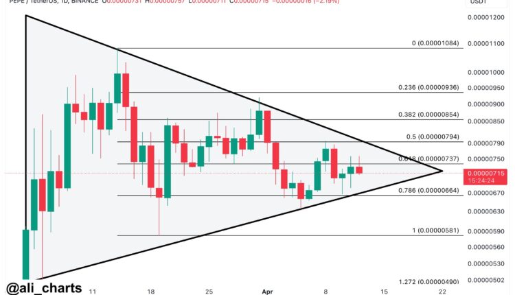 Now, here is the chart shared by Ali that highlights the symmetrical triangle pattern that PEPE has been trading inside recently: